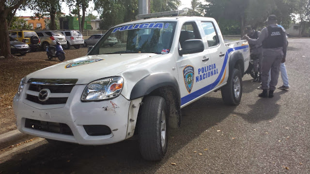 San Pedro de Macoris: Una patrulla policial choco con Dos jóvenes en la Tarde de este sabado quienes transitaban en una Motocicleta marca Loncin de color blanco, el caso fue en la AV Luis Amima Tio frente a la luz de la Zona Franca, uno de los Motorista presenta una Pierna Rota mientras que el otros que le acompaña salio ileso, el herido es Yan Carlos Nova George de 25 años residente en la Calle Hatuy Placer Bonito, mientras que se nota estable el otro joven que lo acompañaba este es Alfredo Flores. Mientras que el caso esta en manos de kos Amet. No tenemos el nombre del Sarvento de la PN que conducia la unidad policial.